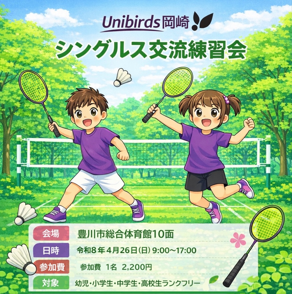 | 4月26日(日) 9時スタート | ユニバシングルス交流練習会を開催! ダブルスの希望がある場合はお問い合わせ下さい。 |